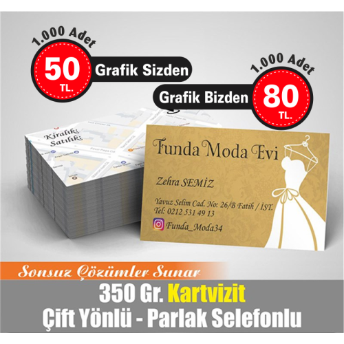 Parlak selefonlu kartvizit baskı süremiz 3 iş günüdür. Çift taraflı parlak selefonlu kartvizitler 350 gr parlak kuşeye basılmaktadır. Çift taraflı parlak selefonlu kartviztlerin ölçüleri 52 mm x 82 mm dir.